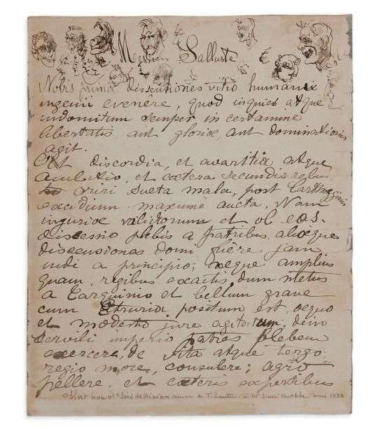 Au recto, devoir de latin avec un texte extrait du livre I des Histoires de Salluste: «Nobis primæ dissentiones vitio humani ingenii evenere»...| dans le haut de la page, 18 petits croquis à la plume: caricatures et têtes d'hommes dont un coiffé d'un casque, deux têtes de chien.