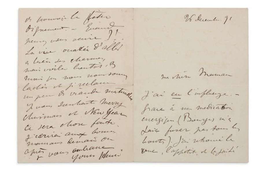 Le jeune peintre annonce à sa mère avoir passé la journée avec son père, dont celle-ci est séparée: «J'ai passé la journée avec papa qui est fort aimable et me paraît peu disposé à fuir le séjour enchanteur de la capitale, quoique le temps soit orageux c.a.d. passablement énervant. Le travail va assez bien et je me remue assez pour exposer à droite et à gauche, ce qui est le seul moyen de se faire voir». Il va lui envoyer «le portrait de Rachou» [ce portrait de Toulouse-Lautrec, peint en 1883 par Henri RACHOU qu'il avait rencontré dans l'atelier de Léon Bonnat, est conservé au Musée des Augustins de Toulouse].