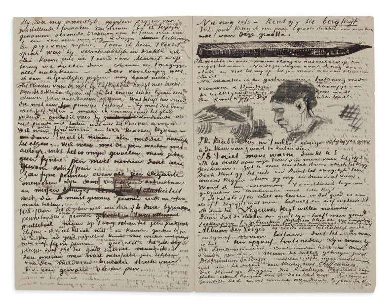 Cette lettre riche de contenu est illustrée de cinq dessins originaux de la main de VAN GOGH à l'encre et au crayon. VAN GOGH est fasciné par la lithographie, il fait remarquer qu'il a acheté un papier relativement cher ainsi qu'un crayon lithographique prévu pour ce genre de papier.