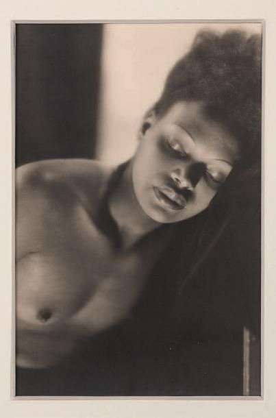 Tirage argentique d'époque inséré sur carton représentant une femme africaine demi-nue.Mention au crayon au verso: «Thèmes pour une flèche arabe et avec les génies noires qui dorment la nuque dans la saignée de mon bras. Eude de nu. Femme au singulier.»Photographie provenant de l'ouvrage «La déesse Cypris » de MONTHERLANT, illustré par Laure