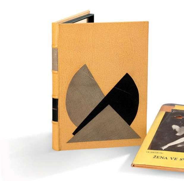 In- 8, couverture toilée souple, jaquette illustrée, emboîtage de maroquin miel.