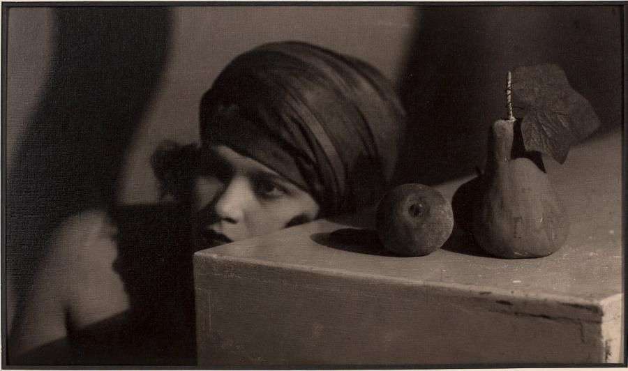 Tirage argentique d'époque représentant une jeune femme au turban à moitié cachée derrière un meuble sur lequel sont posés des fruits.