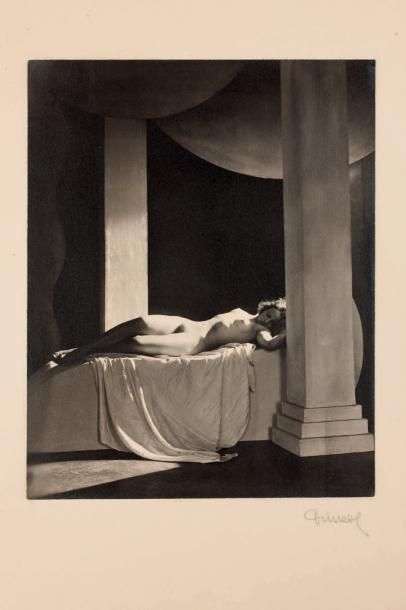 Tirage argentique d'époque contrecollé sur carton et signé au recto par DRTIKOL représentant une femme nue dormant sur un lit de pierre.