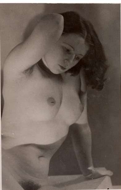 Tirage argentique d’époque sur carte postale signé au verso par le photographe représentant en gros plan un nu féminin.