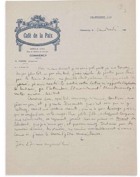 Lettre autographe à l'encre sur papier à entête du café de la Paix à Commercy adressée à Denise Levy dont il est toujours amoureux.