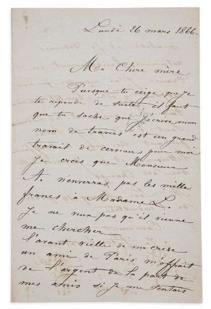 L.A.S., Bruxelles lundi 26 mars 1866, à sa mère| 2 pages in-8 à l'encre.