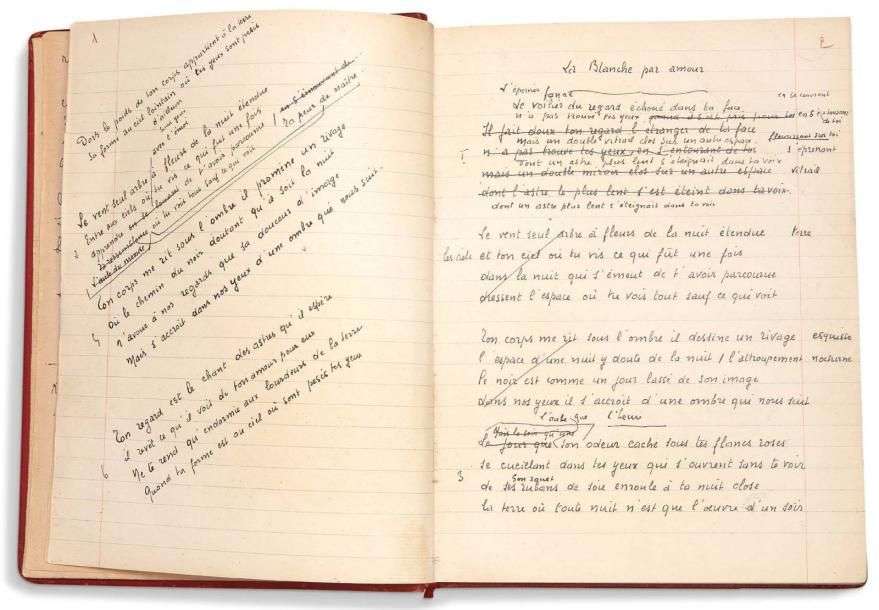 Des notes d'une autre main sur les feuillets de garde et parfois dans le cours du manuscrit, indique que certains textes en ont été intégrés ou publiés, comme «Le Meneur de lune» et «La Neige d'un autre âge». Le cahier s'ouvre sur des poèmes abondamment corrigés.