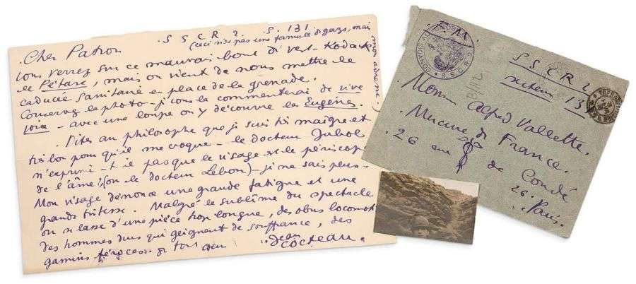 Jean Cocteau a joint une photographie le représentant dans une tranchée, qu'il évoque dans sa lettre