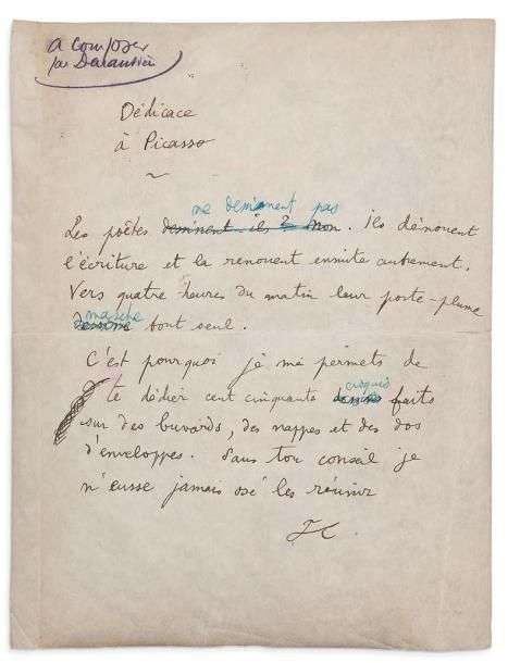 Célèbre texte en partie inédit de la première version de la préface de Dessins, 1924, dédié à Pablo Picasso.