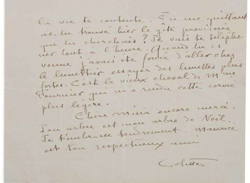 Colette remercie Misia Sert pour un bansaï qu'elle a fabriqué elle-même en jade et corail. [...] «Mon dieu, cher Misia ! Mais je n'ai rien fait qui mérite cela ! C'est si beau que ça devrait être une récompense. Tu me rends heureuse en plantant près de moi ce petit arbre rutilant. Il y restera. Je sais comment tu travailles, presque magiquement, sans regarder, avec des doigts qui voient, merci. Je voudrais tellement que la vie te contente... Ton arbre est mon arbre de noël» [...]