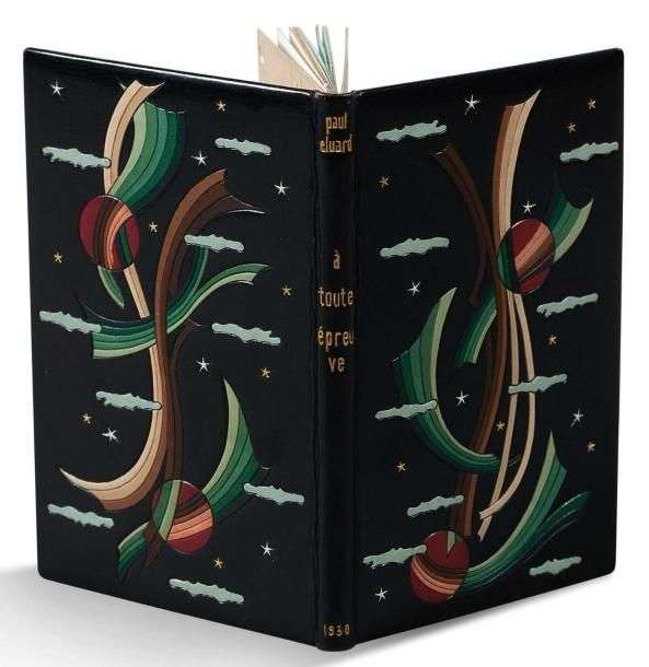 Surréalistes, 1930| in-16, box noir, plats ornés d'un décor de pièces de veau de différents tons de vert, brun et rouge mosaïquées, petits nuages de veau bleu, étoiles de veau blanc, et doré, doublures bord à bord de box ivoire à décor irradiant de filets dorés à froid et d'étoiles dorées et de pièces de veau vert, bleu et rouge, chemise étui (Paul BONET).