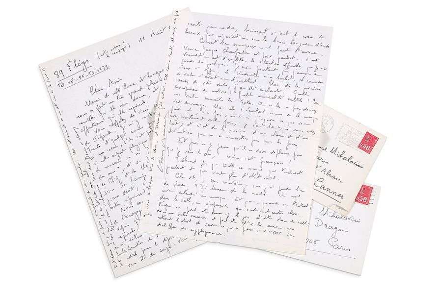 Fléys 11 août 1972. Sa lettre évoque de vieux souvenirs: «le Châlet des Enfants. Je m'y revois comme si c'était d'hier. Trente et quelques années passées n'ont rien changé à nos coeurs»... Il est avec sa femme dans leur propriété de Bourgogne, et y invite son ami... «Je me réjouis d'avance d'entendre cette Cantilène pour mezzo et orchestre de chambre. Je termine ces jours-là pour ma part un truc assez important pour Charles Ravier. C'est une cantate de quelque 40 minutes sur des fragments de la Divine Comédie, pour cinq chanteurs et dix instruments, dont trois anciens mêlés aux instruments d'aujourd'hui. J'espère qu'on le jouera au moins une fois... Ce qui n'est plus le cas des oeuvres que j'écris pour orchestre. C'est pourquoi, d'ailleurs, j'ai renoncé définitivement à écrire de la musique symphonique. Je me raccroche à des ensembles moins vastes, et si je vois que ceux-ci se ferment à leur tour, je renoncerai à la composition musicale»... Il s'essaie par ailleurs à la peinture, sans grand succès, et lit, notamment la passionnante Correspondance de BERLIOZ... Il termine en discutant la qualité de plusieurs de ses enregistrements... Paris 8 avril 1973. «Qui nous débarrassera de l'armée sans cesse grandissante d'incapables qui sévissent Quai Kennedy?». Les programmes sont illisibles| ainsi il a loupé la première audition de Mihalovici, «alors je vous ai écouté par radio [...]. Concert bien ennuyeux... Il faut l'avouer... [...] Mais dès les premières mesures de votre oeuvre, j'ai été enchanté. Quelle transparence de matière! Quelle musicalité subtile!»... Il a pourtant horreur de la radio: «On croit avoir entendu une musique. Et puis, quand on l'entend dans la salle, on s'aperçoit que c'est tout autre chose»...