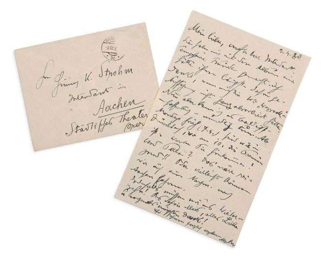 L.A.S., [Wien] 2 avril 1930, à H.K. STROM, Intendant du Städlischer Theater (Opéra) d'Aachen (Aix-la-Chapelle)| 1 page in-8, enveloppe (timbre manquant)| en allemand.