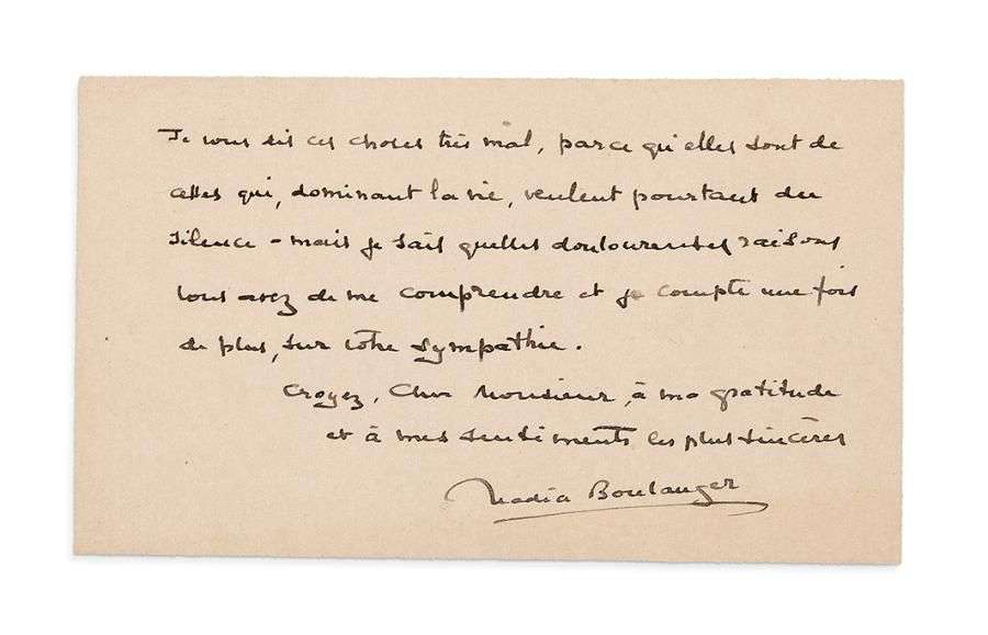 Peu après la mort de sa soeur, Lili Boulanger (1893-1918), décédée le 15 mars 1918. «C'est avec beaucoup d'émotion que j'ai lu les lignes que vous avez consacrées aux oeuvres de ma pauvre petite soeur et je viens vous en remercier de tout coeur. Il est profondément doux de sentir que pour défendre une chère mémoire, on est aidé, soutenu, par des êtres que l'on sait sensibles, sans qu'ils aient les raisons que l'on a soi-même pour agir dans un certain sens. Je vous dis ces choses très mal, parce ce qu'elles sont de celles qui, dominant la vie, veulent pourtant du silence. Mais je sais quelles douloureuses raisons vous avez de me comprendre et je compte une fois de plus, sur votre sympathie»...