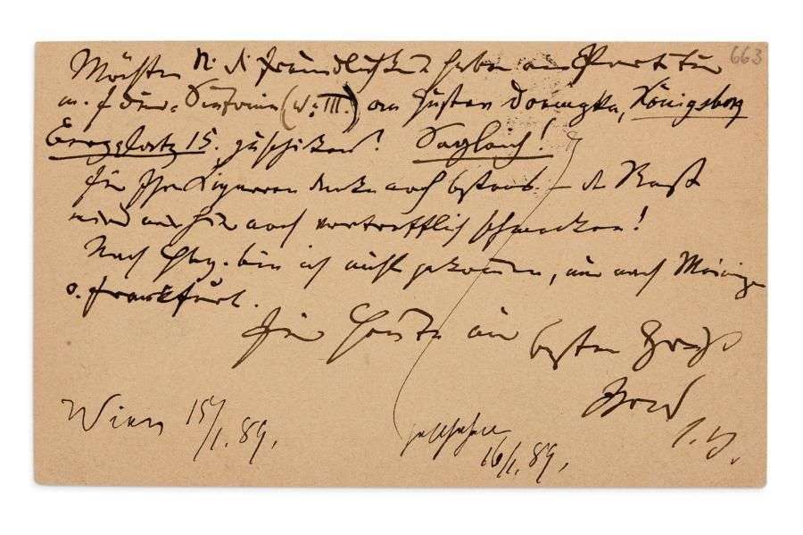 L.A.S. «J.B.», [Wieden-Wien 15 janvier 1889], à son éditeur Fritz SIMROCK à Berlin| 1 page oblong in-12, adresse au verso (Correspondenz-Karte)| en allemand.
