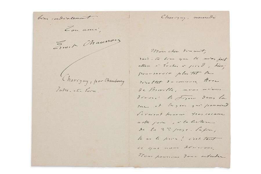 Belle lettre de félicitations à son ami qui vient de remporter le prix de composition de la Ville de Paris pour Le Chant de la Cloche. «Enfin, tu as le prix! [...] Nous pourrons donc entendre l'Incendie, et le reste... [...] Indépendamment de l'amitié très vraie que j'ai pour toi, ton succès me fait aussi grand plaisir parce qu'il rejaillit un peu sur le pauvre père FRANCK. Et puis, en faisant une oeuvre très sincère, sans préoccupation d'un concours quelconque, sans compromis, tu as trouvé le moyen de forcer le jury à te donner le prix| c'est très rare et cela ne peut avoir lieu que pour une oeuvre de premier ordre. Naturellement, mon opinion sur toi était faite depuis longtemps et ce n'est pas ce jugement qui m'a appris ce qu'il faut penser de toi, mais il empêchera les imbéciles de te discuter et cela me fait plaisir»...