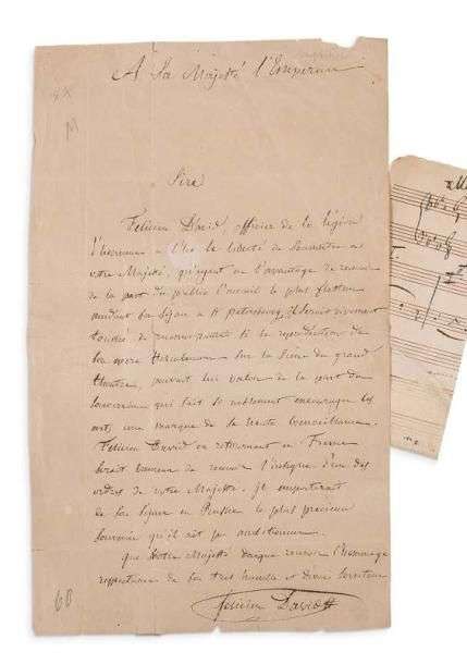 + L.A.S. (minute) et P.A.S. musicale, 1865| 1 page petit in-4 (déchirures et réparations au verso), et 1 page oblong grand in-8 (un coin restauré sans toucher la musique). [Saint-Petersbourg 1865], à S.M. l'Empereur [de Russie, ALEXANDRE II]. «Félicien David, officier de la Légion d'honneur a la liberté de soumettre à votre Majesté, qu'ayant eu l'avantage de recevoir de la part du public l'accueil le plus flatteur pendant son séjour à St Pétersbourg, il serait vivement touché de reconnaissance si la reproduction de son opéra Herculanum sur la scène du grand théâtre, pouvait lui valoir de la part du souverain qui sait si noblement encourager les arts une marque de sa haute bienveillance. Félicien David en retournant en France serait heureux de recevoir l'insigne d'un des ordres de votre Majesté. Il emporterait de son séjour en Russie le plus précieux souvenir qu'il ait pu ambitionner»...