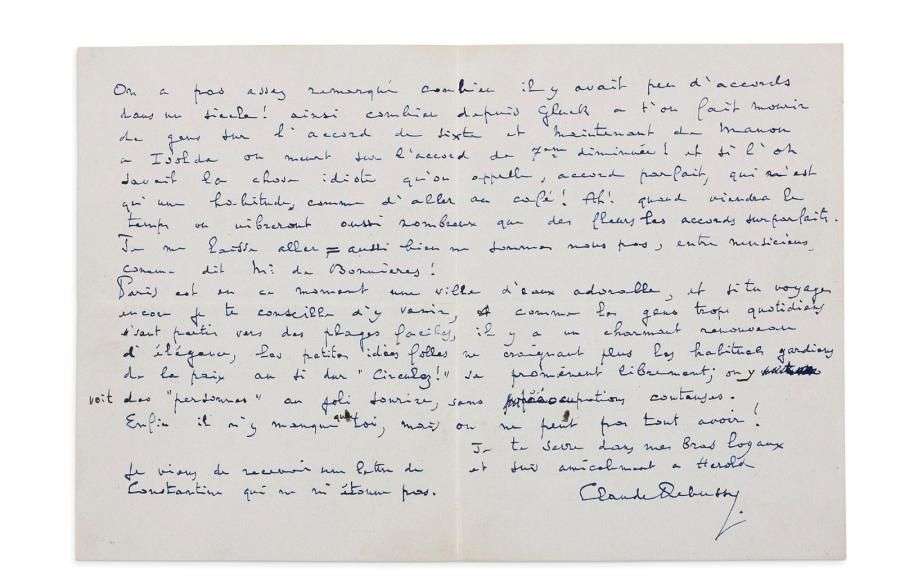 Très belle lettre, pleine d'humour, sur l'avancement de Pelléas et Mélisande. «Il y a des jours et des jours que je voulais répondre à ta lettre qui vraiment contenait tout le soleil de Constantine, mais j'ai tellement manié de doubles croches ces temps-ci que la force me manquait pour te dire les quelques anecdotes adéquates à ces mêmes doubles croches| j'ai donc travaillé comme un cheval d'omnibus: fait la scène des souterrains, et au sortir des mêmes souterrains, la scène des moutons! et des moutons! on en mangerait! Enfin je suis le bon petit garçon des images d'Épinal! celui qui embrasse le sous-préfet avec des larmes dans les yeux! Seulement le Barbare qui est en moi, veille, et mordra le sous-préfet à la première occasion.
