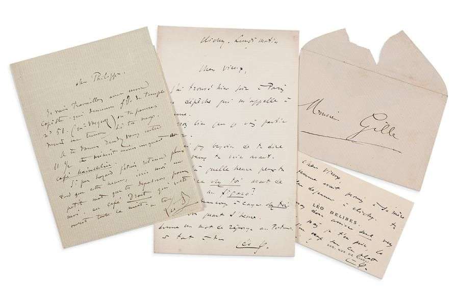 3 L.A.S. «Léo D.», à Philippe GILLE| 1 page in-12 avec adresse, 1 page in-8, et une carte de visite à son adresse 220 rue de Rivoli avec enveloppe.