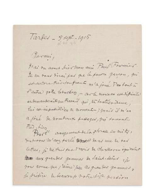 L.A.S., Tarbes 8 septembre 1915, à Gustave SAMAZEUILH| 2 pages in-4.