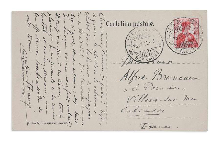 L.A.S. sur carte postale, [Lugano 16.IX.1911], à Alfred BRUNEAU à Villers-sur-mer| carte postale illustrée (Lago di Lugano, Oria, Villa Fogazzaro), texte et adresse au dos avec timbre. «Cher ami, comme ça passe! Enfin, il y aura le plaisir de se retrouver bientôt pour labourer de compagnie rue de Madrid! J'ai travaillé comme des nègres, et avec entrain| et je suis bien sûr que vous en avez fait autant!»...