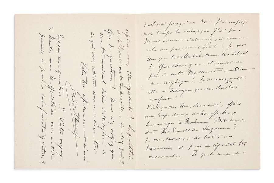 Il a eu de ses nouvelles par son fils: «Hélas, il me semble que le Concert et les Théâtres ne vous ont pas laissé jouir longtemps de vos vacances! Il est vrai, par juste compensation, que les répétitions de l'Opéra vous rappelaient également à Paris? Êtes-vous satisfait du travail et du zèle général? [...] J'ai employé mon temps le mieux que j'ai pu. Mais comme c'est long, et comme cela me paraît difficile! Je vois bien que le collaborateur habituel de Gunsbourg... et aussi un peu de notre Massenet - Dieu - me néglige. Je ne vais pas aussi vite en besogne que ces illustres confrères!»... Ils se reverront lors des examens, et demande quand il sera représenté [il s'agit du ballet de Bruneau, Les Bacchantes], et si la partition va paraître... «Votre voyage à Nantes avec M. Guist'hau [ministre de l'Instruction publique et des Beaux-Arts] vous a-t-il permis de parler de la funeste guitare?»