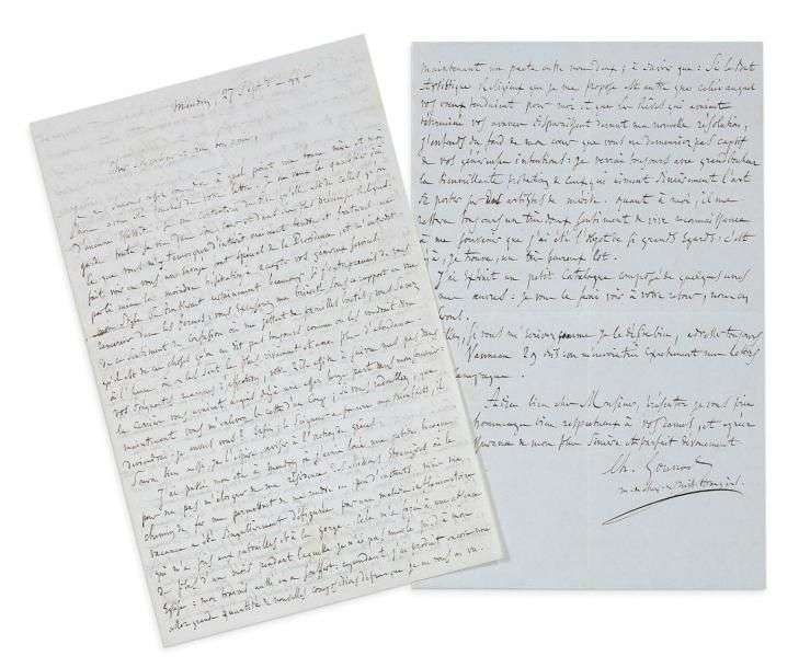 Gounod est très sensible au tendre intérêt que lui porte Vendeuvre et le considère comme un envoyé tout spécial de la Providence... Il a passé l'été à Meudon où il a loué «une petite bicoque» près du chemin de fer pour pouvoir se rendre facilement à l'église des Missions Étrangères, dont il est le maître de chapelle, mais une maladie inflammatoire l'en a tenu éloigné tout un mois. Il a cependant produit une assez grande quantité de nouvelles compositions: «C'est de musique sacrée que je me suis spécialement occupé et que je m'occuperai même désormais uniquement. Cette pauvre musique sacrée est depuis assez long-tems délaissée pour que des âmes un peu charitables viennent l'exhumer et la ressusciter: je crois que l'heure est venue. L'homme a depuis plus d'un siècle assez activement remué le sol des passions et de la sensualité brute| à nous maintenant de sillonner celui de vrais sentiments de l'âme et de lui montrer que sa route est plus haut. C'est assez vous dire que j'ai complètement renoncé à la carrière dramatique»... Il fait part de sa détermination à embrasser définitivement l'état ecclésiastique, tout en demandant le plus fidèle secret. Ses sentiments religieux n'ont fait qu'augmenter de jour en jour: «plus je me suis rapproché de Dieu plus j'y ai senti d'attrait: puis de vivre auprès de lui j'en suis venu à désirer de vivre en lui [...] J'ai cru me sentir appelé au ministère ecclésiastique [...] et me voici maintenant amené à ne pouvoir plus me refuser à cet appel. C'est une grâce immense que Dieu me fait là: il m'y a conduit comme par la main [...] me laissant en quelque sorte grandir sous le soleil des sentiments jusqu'à ce que je fusse capable d'être éclairé par celui des idées de la foi»... Puis il se livre à quelques réflexions «sur le temps que me demandero