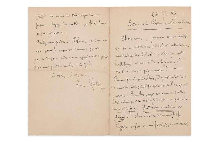 + L.A.S., [Bruxelles] 26 janvier1889, à ses amis l'éditeur Georges HARTMANN et le librettiste Paul MILLIET| 3 pages et demie in-8.