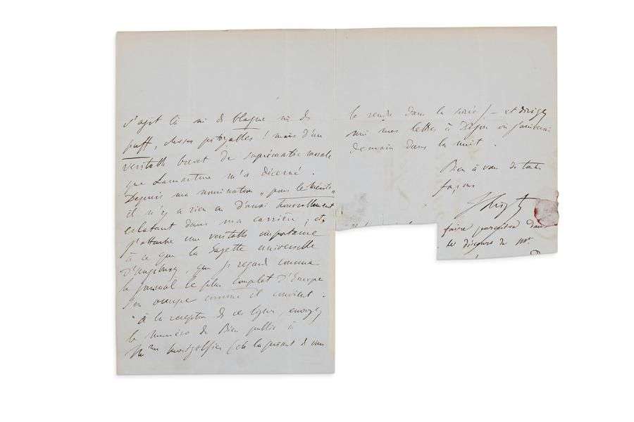L.A.S., [Mâcon fin mai 1845], à Jean-Baptiste Gaspard BENACCI (marchand de musique et de pianos) à Lyon| 2 pages et demie in-8, adresse (bas du 2e feuillet découpé pour récupérer la coupure de presse collée par Liszt).