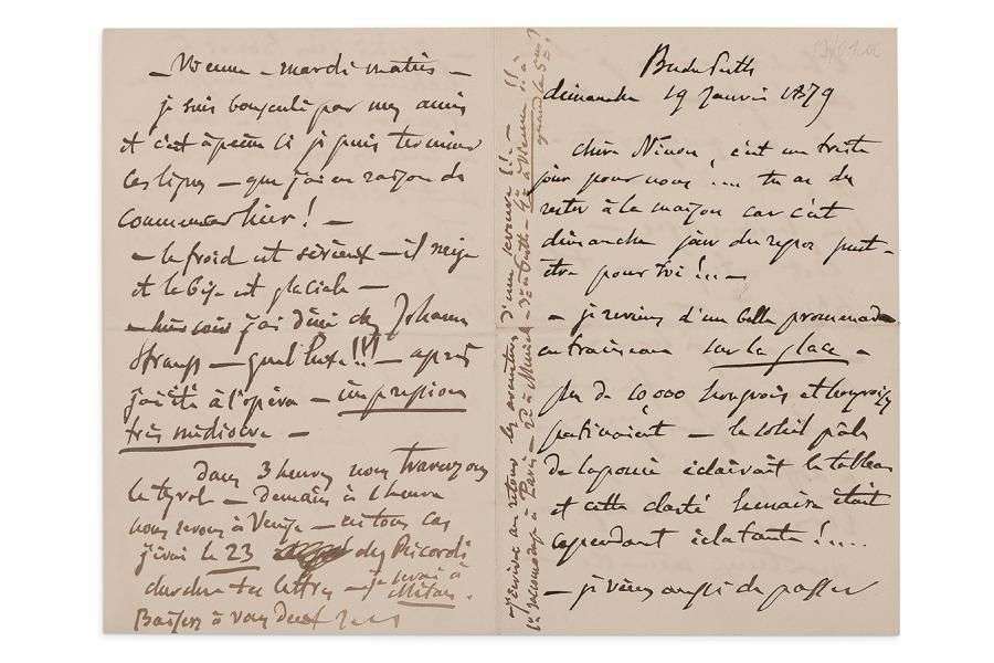 Revenant d'une belle promenade en traineau sur la place, où «plus de 10.000 Hongrois et Hongroises patinaient - le soleil pâle de Laponie éclairait le tableau et cette clarté lunaire était cependant éclatante!... - Je viens aussi de passer l'habit noir. Je dîne chez LISZT - on veut me voir dans quelques théâtres et je dois aller me montrer dans plusieurs loges. C'est grotesque - et bien fatigant». Il terminera ses courriers le lendemain, et notamment «à différents raseurs de Paris!!»... Il n'a rien trouvé à acheter, «tout aussi cher et moins bon qu'à Paris - toutes les lorgnettes de la haute société sont achetées à Paris»... Il espère rapporter un peu d'argent, «cela me consolera - si je m'arrête à Venise je verrai pour un lustre». Vienne mardi matin. Il termine sa lettre: «Je suis bousculé par mes amis et c'est à peine si je puis terminer ces lignes [...] Le froid est sérieux - il neige et la bise est glaciale». La veille il a dîné chez Johann STRAUSS: «Grand luxe!!! - Après j'ai été à l'opéra - impression très médiocre. Dans 3 heures nous traverserons le Tyrol». Il sera le 23 à Milan...