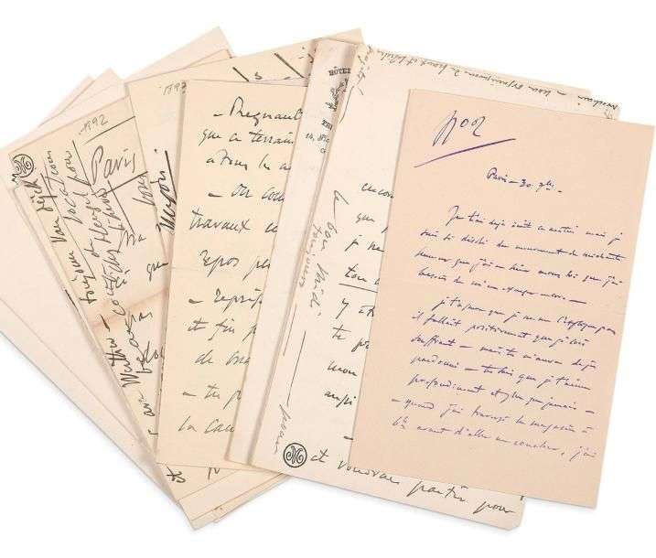 Paris 30 septembre [1884?]: «tu sais que je t'aime profondément et plus que jamais. [...] Je n'ai rien trouvé ce matin... cela viendra demain - on n'écrit pass tous les jours le Ve acte!»... [1885?]: «J'ai besoin de te dire encore que tu es toute ma vie, que je t'aime tant et que je ne pense qu'à une chose: ton bonheur - que ne puis-je y être pour "peu" même et te prouver à chaque instant mon affection si reconnaissante aussi, tu le sais bien»... Versailles [juin? 1886], sur Werther: «Voilà déjà toute une grande scène ébauchée!»... [Neuchâtel 1887?], dessin de la pluie, en attendant sa correspondance à la gare: «je me console en avalant des vers de cognac [...] et en t'envoyant, chère et bonne Ninon, mes plus affectueux baisers ainsi qu'à Juliette vilain mon monstre»... Grenoble Lundi 22 [octobre 1888]. Il a quitté Vevey| il va à Uriage pour voir son «pauvre vieux maître» Ambroise Thomas... [1890]. Projet d'achat d'un terrain, et de travaux: «à ton retour (automne 90) 1ère du Mage à l'Opéra et pendaison de la crémaillière. - D'ici là nous resterons rue du général Foy»... Vendredi [juin 1890?]. «Je crois avoir trouvé le rêve comme demeure - 73 bd de Clichy [...]. Splendide atelier au 1er (un petit 1er) plafond à caissons! De chaque côté 2 belles chambres»... Il détaille les agréments et propose quelques aménagements. «Le tout (très vaste comme nombre de chambres): 4600f»... [1892 ou 1893?]. Il part pour Bruxelles: «Je ne veux pas te faire de la peine en te parlant de mes tristesses... Je n'ai rien de plus cher que ton bonheur - mais j'ai l'esprit malade, alors, car malgré les circonstances qui se combinent pour Thaïs à l'Opéra, malgré Manon, malgré l'aspect fortuné de la situation je n'ai qu'un désir, dési