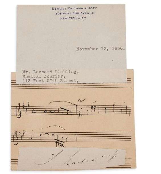 Serge RACHMANINOFF: thème autographe de 4 mesures, avec signature rapportée et fragment de papier à son en-tête.