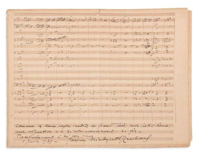 Fragment orchestral noté sur 15 portées sur papier Lard-Esnault à 20 lignes, avec l'indication au crayon «moins vite».