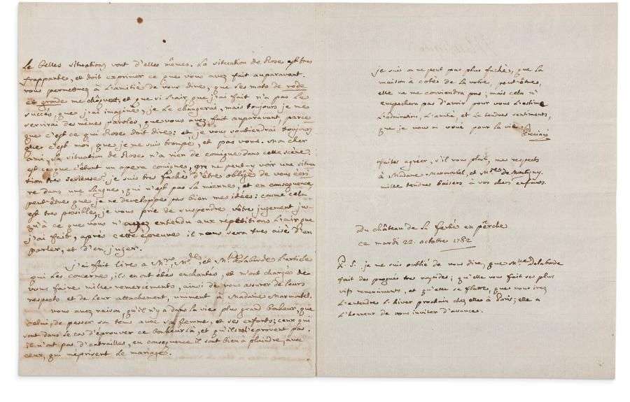 L.A.S., château de La Ferté au Perche 22 octobre 1782, à Jean François MARMONTEL à Grignon| 3 pages in-4, adresse.