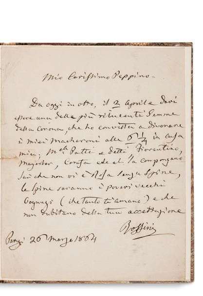 Amusante invitation à manger ses macaronis. «Mio Carissimo Peppino - Da oggi in otto, il 2 Aprile devi essere une delle più rilucenti Gemme della Corona, che ho convitta a divorare i miei macheroni alle 6 ¼ in casa mia| Mlle Patti et detti Fiorentino,Mayerber, Carafa etc etc la compongano Saì che non vi è Rosa senza spine, le spinne saranno i poveri vecchi bagnuzi (che tanto ti amano) e che non dubitano della tua accettazione»... La soirée du 2 avril sera une des plus brillantes pierreries de la couronne| il invite chez lui, pour dévorer ses fameux macaronis, Adelina Patti, le critique Fiorentino, Meyerbeer, Carafa, etc. Comme il n'y a pas de rose sans épines, les épines seront les pauvres vieux baigneurs, qui aiment tant Peppino, et comptent sur son acceptation...