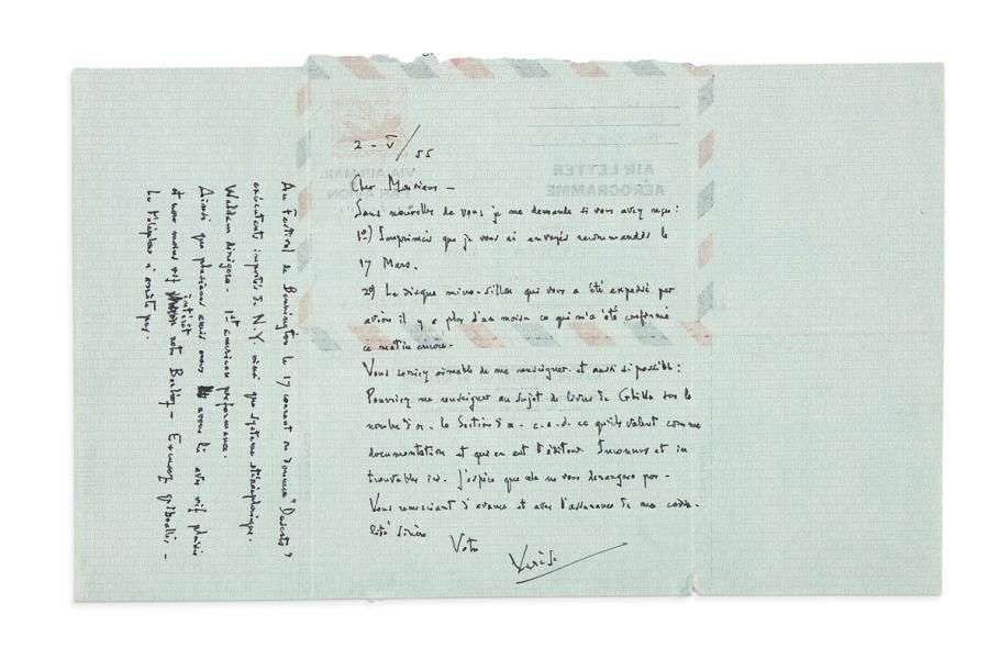 L.A.S., New York 2 mai 1955, au musicologue Jean ROY| 1 page in-4 sur aérogramme, adresse au verso.