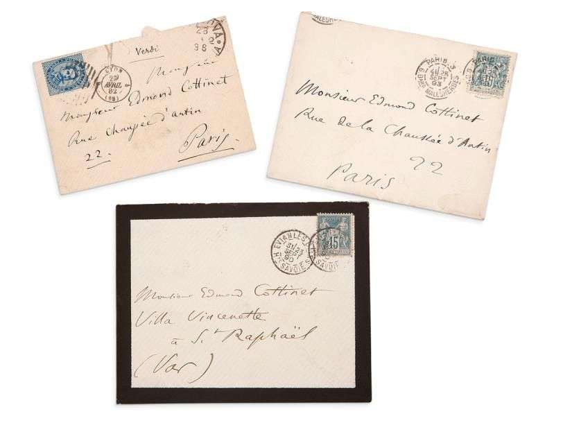 On joint 2 enveloppes autographes de Camille SAINT-SAËNS à Edmond Cottinet, Villa Vincenette à Saint-Raphaël (23 septembre 1890) et à Paris (25 septembre 1893)..