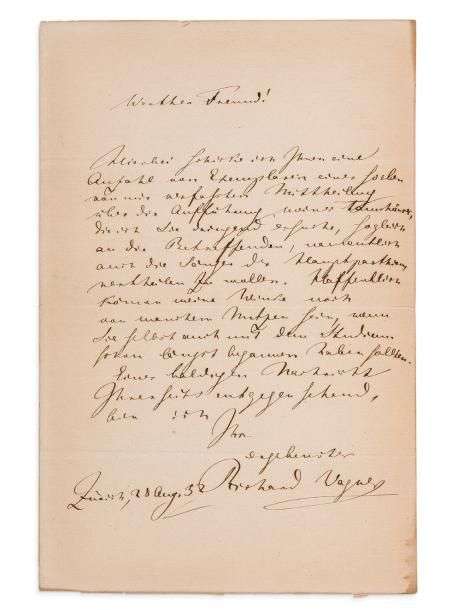Il envoie à son ami un certain nombre de copies d'une série de suggestions qu'il vient d'écrire, concernant la représentation de son Tannhäuser. Il le prie instamment d'avoir l'obligeance de les distribuer auprès des personnes concernées, surtout parmi les chanteurs des grands rôles. Il espère que ses indications pourront encore servir, même s'il a déjà commencé l'étude de l'ouvrage...