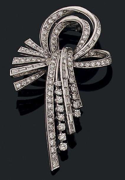 Broche "boucle" en platine (950) et or gris 18k (750) sertie de lignes de diamants baguettes et de diamants de taille brillant. Vers 1950.
