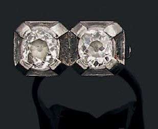 Bague en or gris 18k (750) et platine sertie de deux diamants de taille ancienne forme coussin.