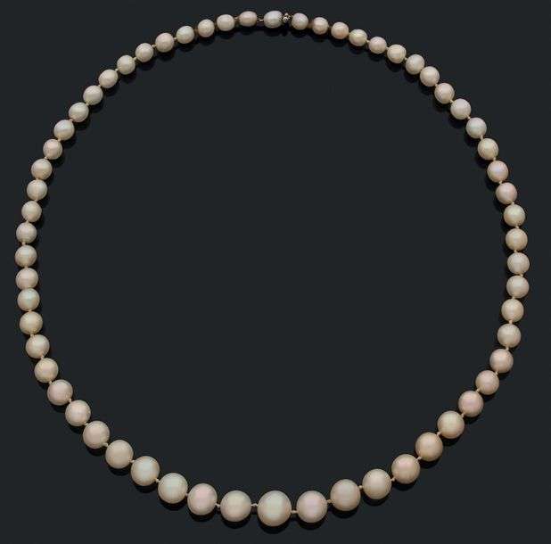 Collier composé de 60 perles fines en chute. Fermoir orné d'une perle. Pb.: 30.07gr. Accompagné d'un certificat LFG N° 347985 attestant perles fines, eau de mer