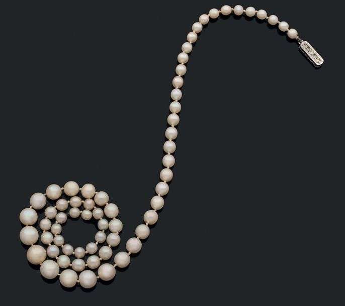 Collier composé de 65 perles fines en chute.