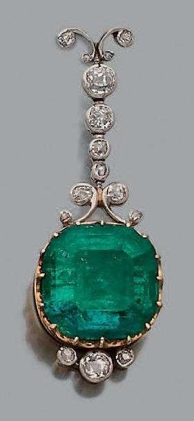Elément de pendentif en or jaune et gris 18k (750) composé d'une chute de diamants de taille ancienne retenant une importante émeraude de taille coussin de forme carrée.