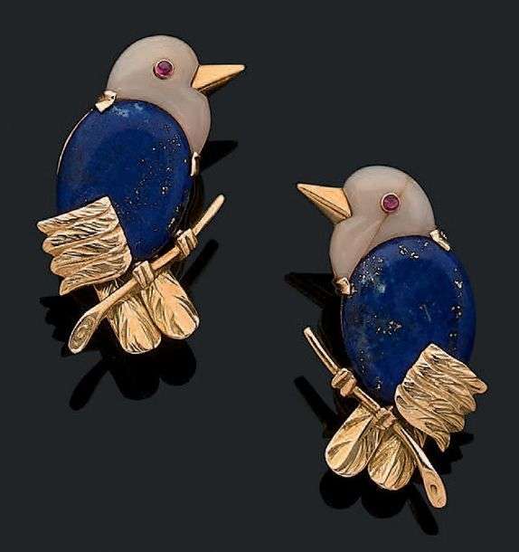 Paire de clips d'oreilles en or jaune 18k (750) «oiseaux» au plumage ciselé et ornés d'un motif de lapis lazuli pour le corps et agate pour la tête. Vers 1950. Signés et numérotés. Dans leur écrin d'origine.