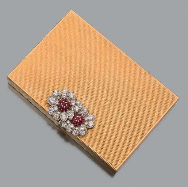 Poudrier rectangulaire en or jaune 18k (750) orné d'un fermoir composé de deux fleurs en platine (950) serties de rubis et diamants. Vers 1950.
