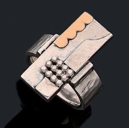 Bague en argent martelé (<800) et or jaune 18k (750) de forme rectangulaire à décors de lignes et de sphères.