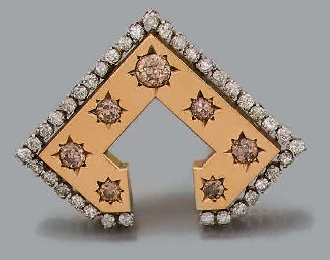 Clip de forme carrée à section ouverte en or jaune 18k (750) et platine (950) serti en étoile de diamants de taille ancienne de couleur cognac rehaussé d'une ligne de brillants.
