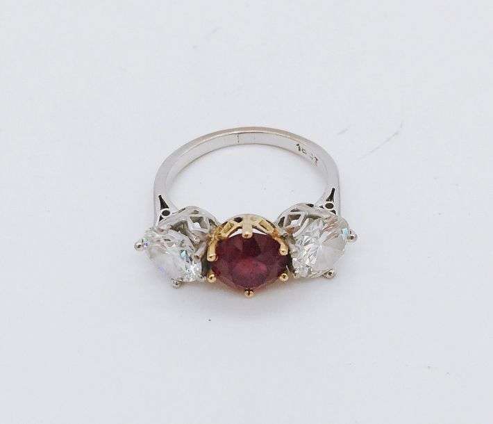 Bague en or gris 18k (750) sertie d'un rubis rond épaulé de deux diamants