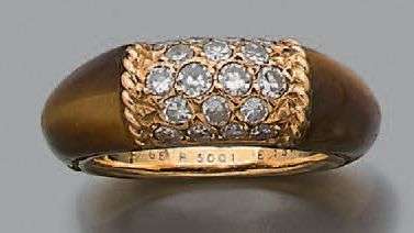 Bague «philippine» en or jaune 18K (750) sertie d'un pavage de brillants épaulé de motifs d'oeil de tigre.