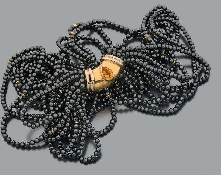 Collier de perles d'hématite orné au centre d'un motif formant fermoir en or jaune et gris 18k (750) serti d'une citrine en goutte.
